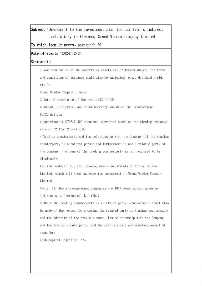 Amendment to the investment plan for Lai Yih's indirect subsidiary in Vietnam, Grand Wisdom Company Limited.