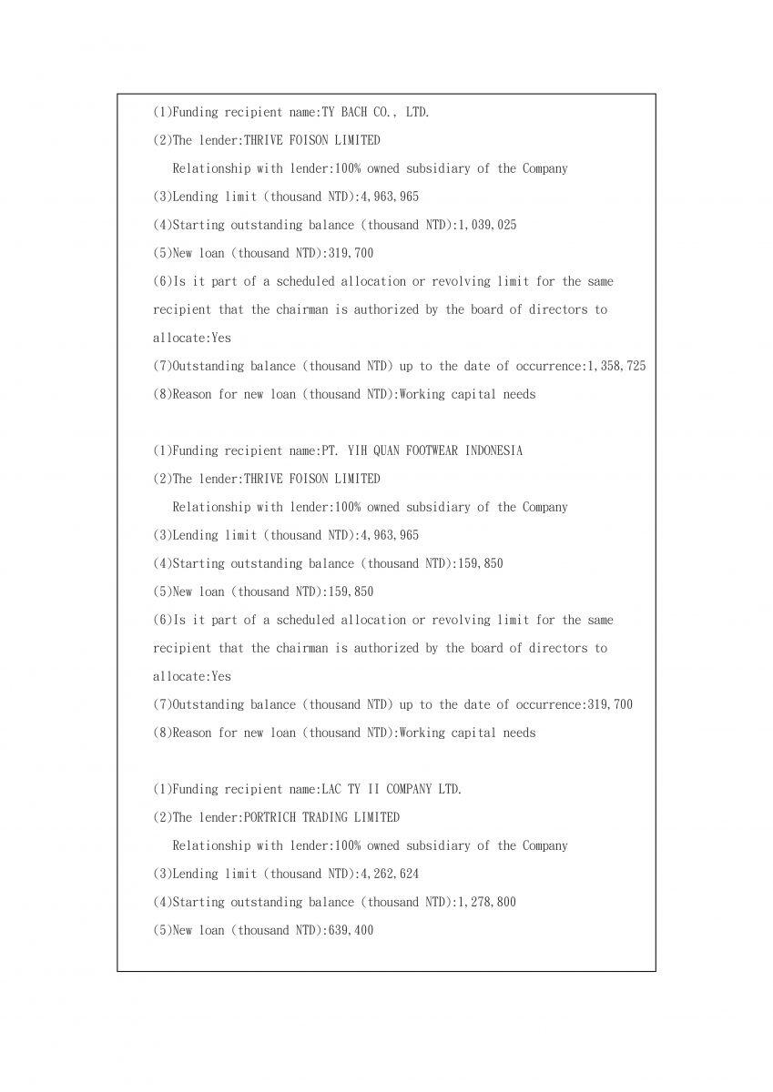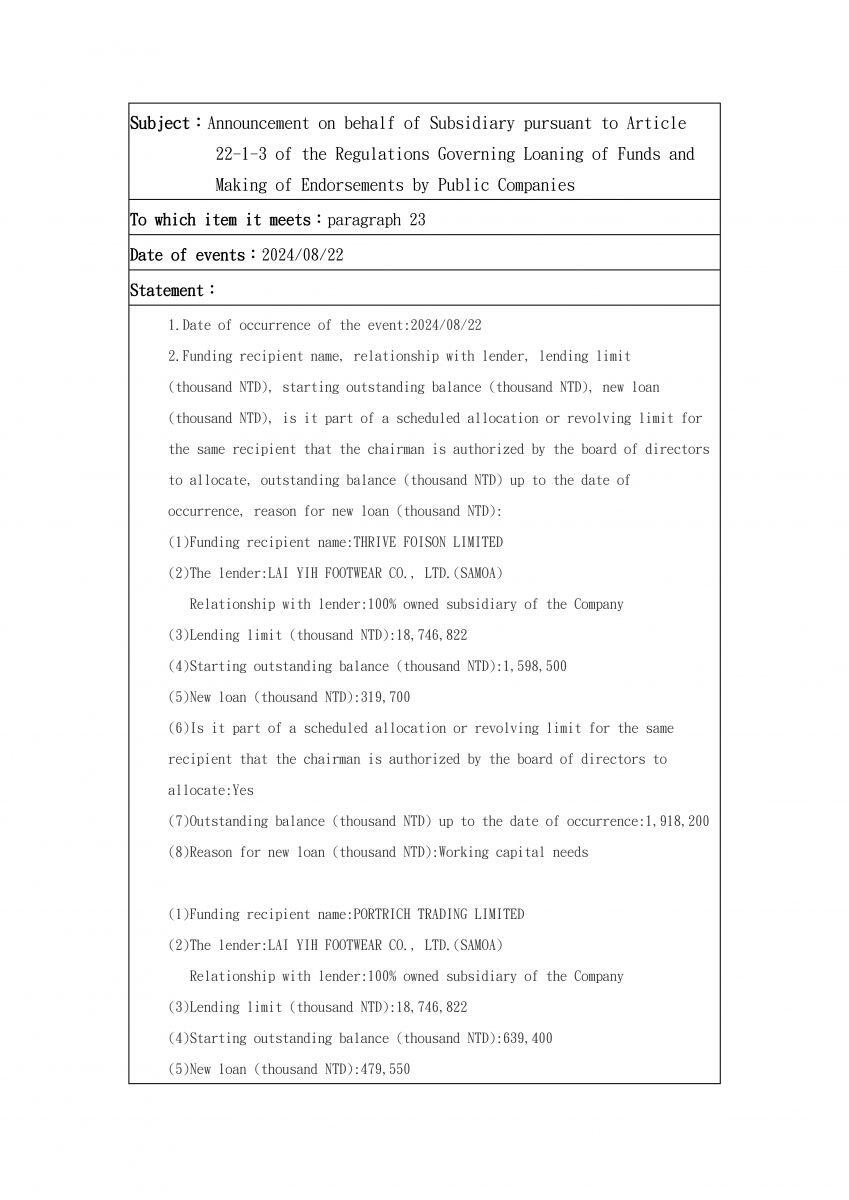 Announcement on behalf of Subsidiary pursuant to Article 22-1-3 of the Regulations Governing Loaning of Funds and Making of Endorsements by Public Companies