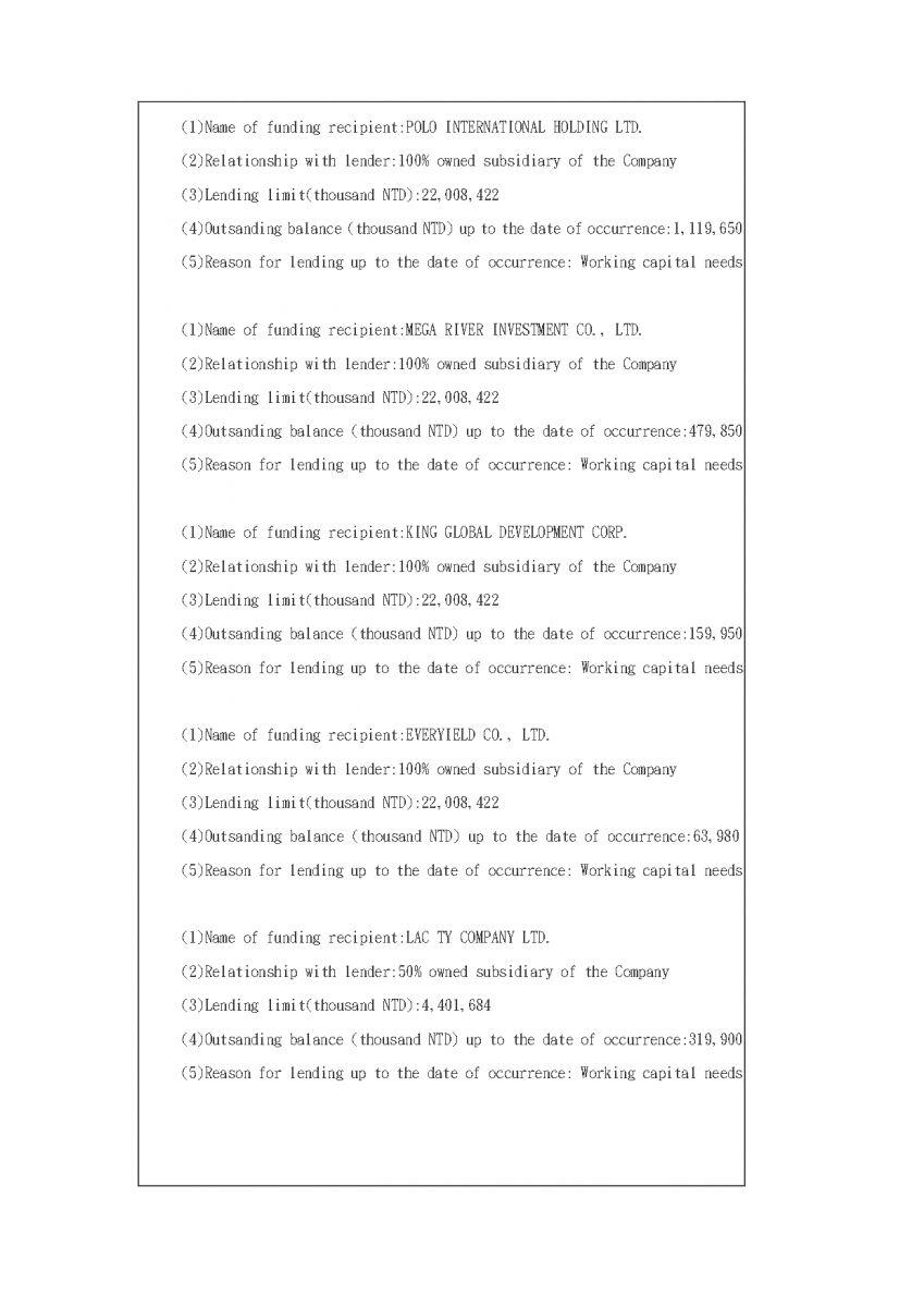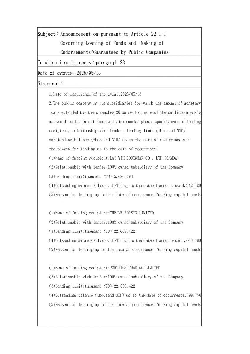 Announcement on pursuant to Article 22-1-1 Governing Loaning of Funds and Making of Endorsements/Guarantees by Public Companies
