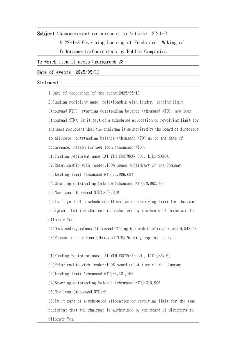 Announcement on pursuant to Article 22-1-2 & 22-1-3 Governing Loaning of Funds and Making of Endorsements/Guarantees by Public Companies