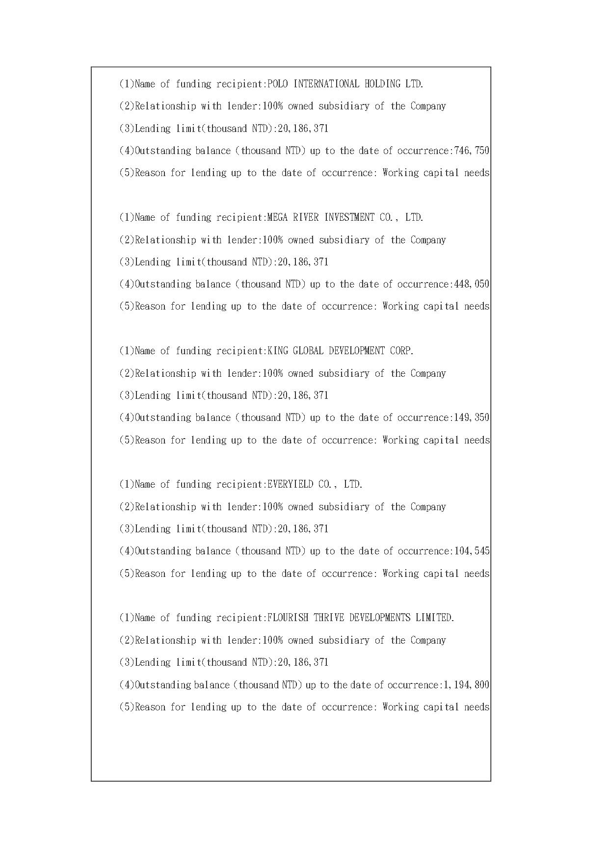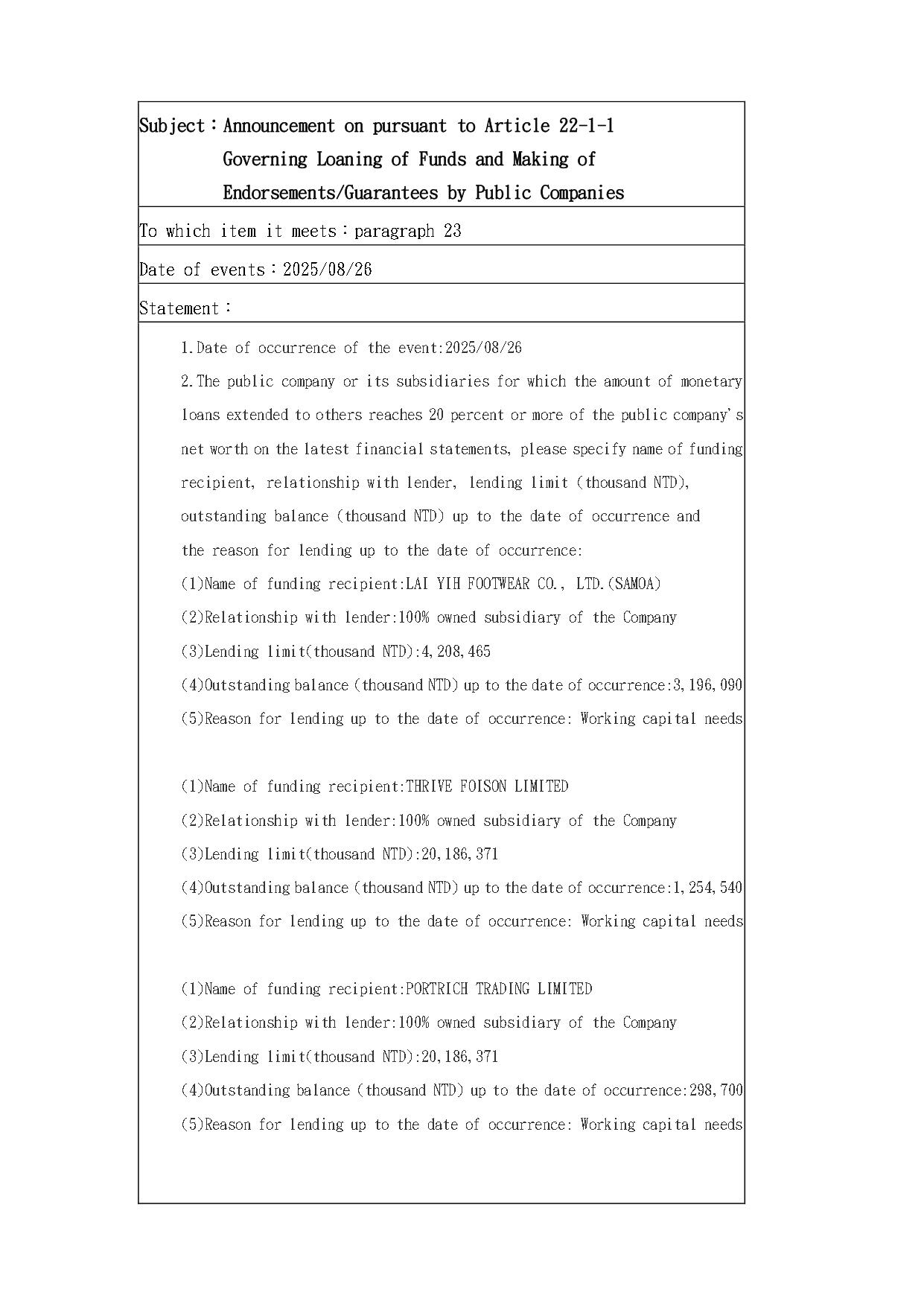 Announcement on pursuant to Article 22-1-1 Governing Loaning of Funds and Making of Endorsements/Guarantees by Public Companies